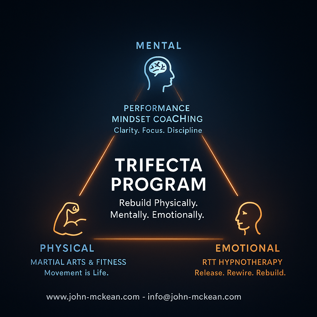 The only program that fuses Martial Arts Training, Performance Mindset Coaching, and RTT Hypnotherapy into one powerful system for lasting transformation.